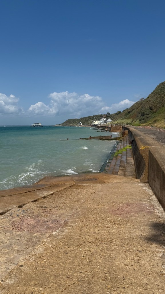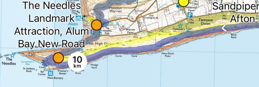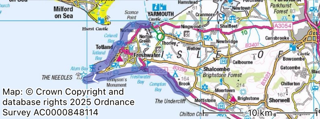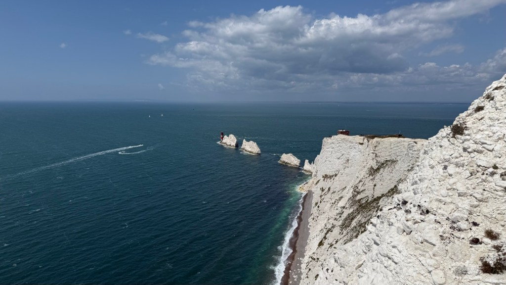 The Needle was slightly marred by the coastguard station’s metal mesh fencing and throngs of tourists. Lunch choices were ropey at the Alum Bay amusement park. We would have been better off waiting until Colwell Bay.