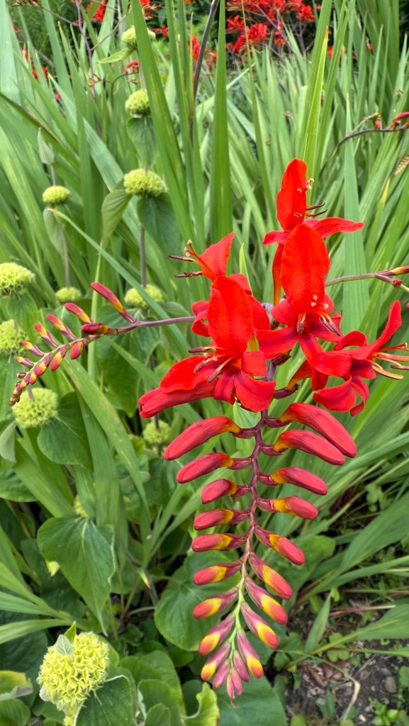 There was a row of standalone trellis for climbing roses that used loose chains dangling between posts. It looked like a good idea and more elegant than my taut wires.