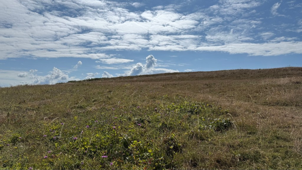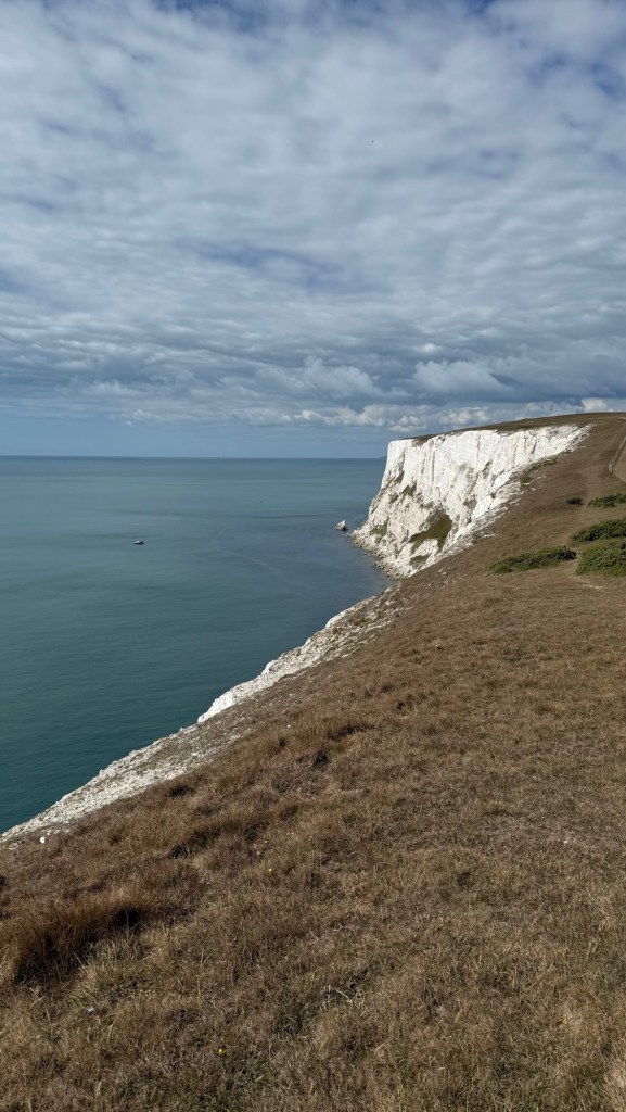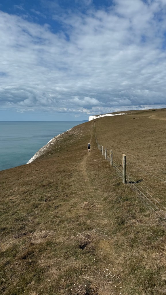 We took the ‘daring’ path that was outside the fence and walked on cliff edge. Seagulls flew close to the top of the chalky cliff faces. I saw them in their element for the first time, not dead-eyed pests on park benches. There were many openings in the ground, some made by rabbits. I wonder how often the fences have to be moved inland.