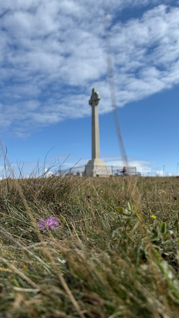 But I found out about this outrage only later. At this moment of setting off from the pub, my spirit soared with the steep climb up through a woodland then out on to Tennyson Down and his monument! Everything was perfect: blue sky, candy floss clouds, buzzing meadows, the sun all round, the sea below, the smiles and awe in my companions.