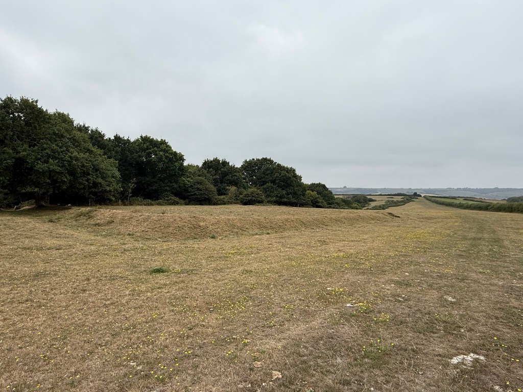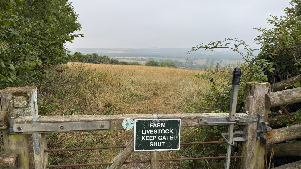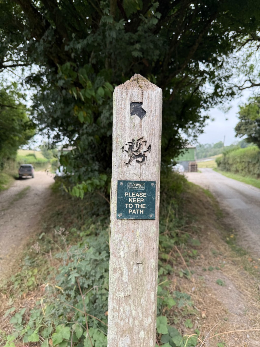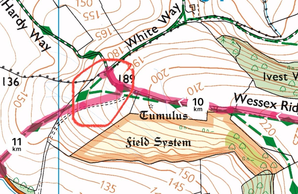 After a lovely field that contained the ancient enclosure on a gentle slope, we came to a section of the path that overlapped with the Hardy Way briefly. The area was confused and overgrown in places. The mapped path was unpassable at a point, while the farm track didn’t quite join up with the path either. Some awkward scrambling was needed.
