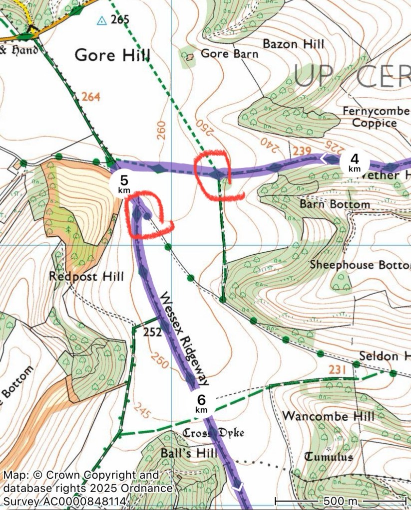 Not long after, on Gore Hill, we came to the most confusing junction of the walk so far. The obvious track was to the northwest, while the Ridgeway was due west. But the way mark was pointing to the northwest track.