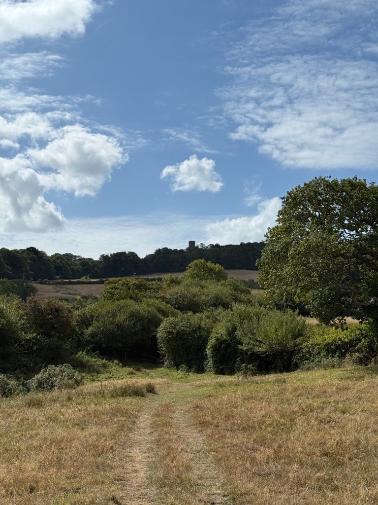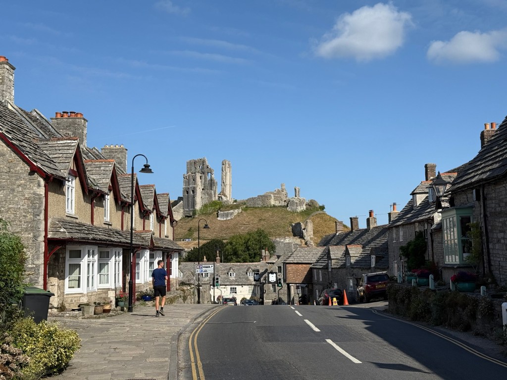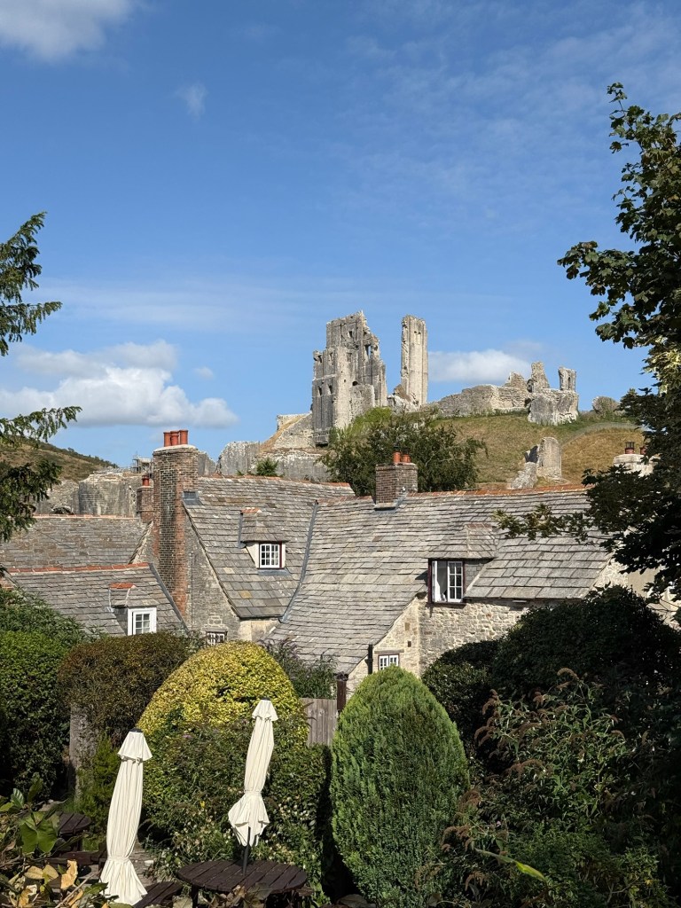 Kingston was a small village with an outsized, new-looking church. The houses in grey stones and thick roof tiles continued from Corfe, and were all the more striking in smaller numbers, with trees and fields as a backdrop.