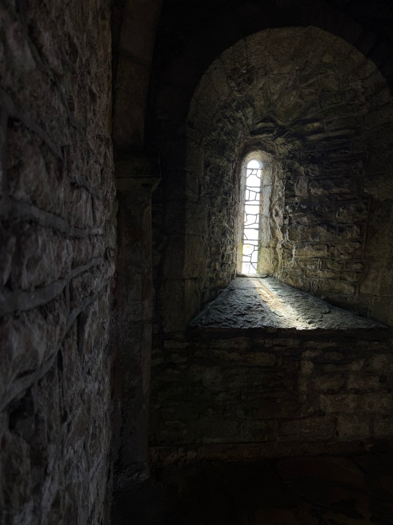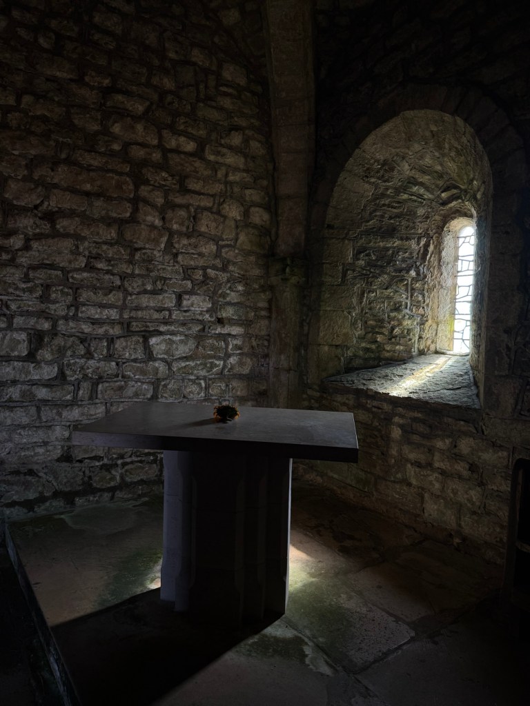 The chapel was certainly worth the detour. It was a beautiful structure, a darker grey than all the greyness of the area. The thin, long window was a moving sight; it was more effective in anchoring your attention than any monumental architecture or icon in the grandest church.